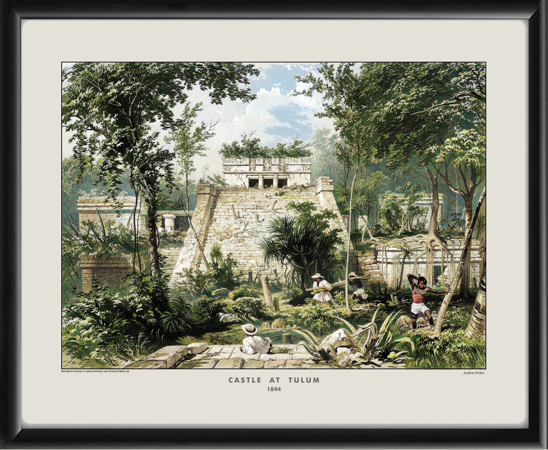 Restored view of the Castle at Tulum, Yucatan, Mexico, 1844 by Andrew Picken, from “Views of Ancient Monuments in Central America, Chiapas and Yucatan” published by Frederick Catherwood.