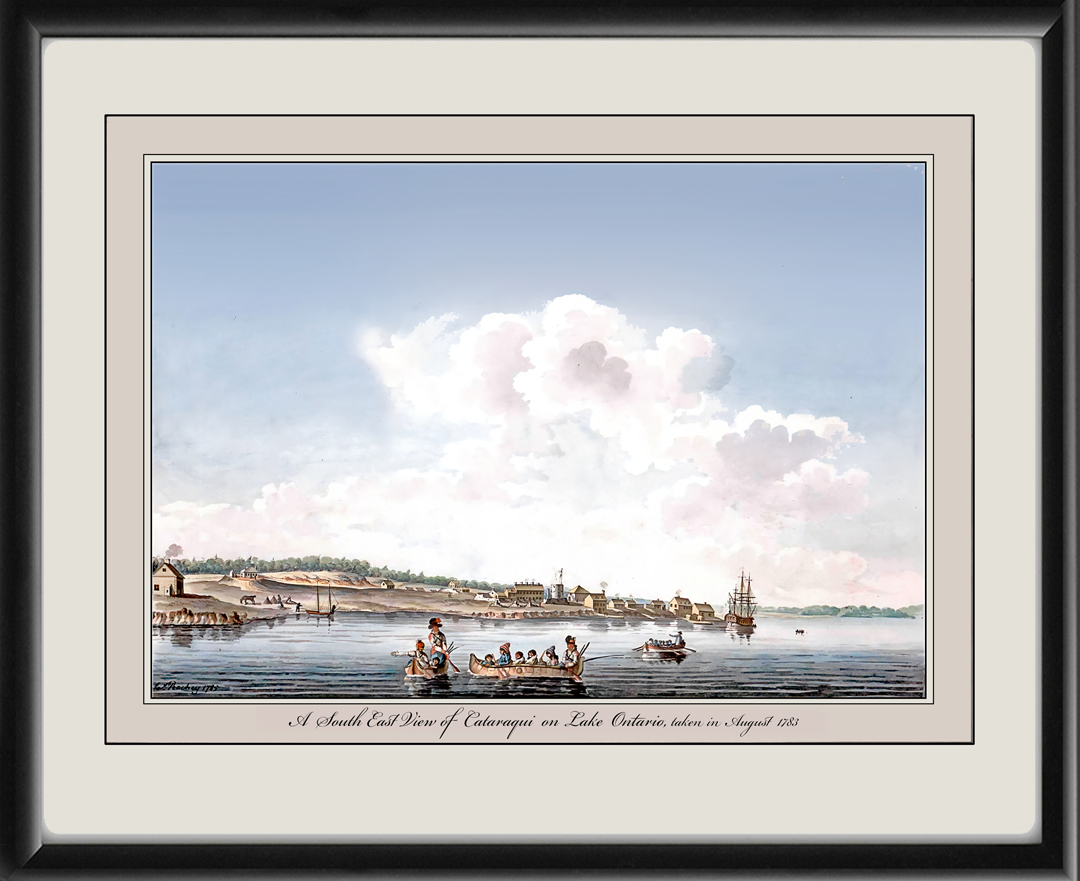 Restored southeast panoramic view of Cataraqui (Kingston) on Lake Ontario, 1783 from the original watercolor painting by James Peachey