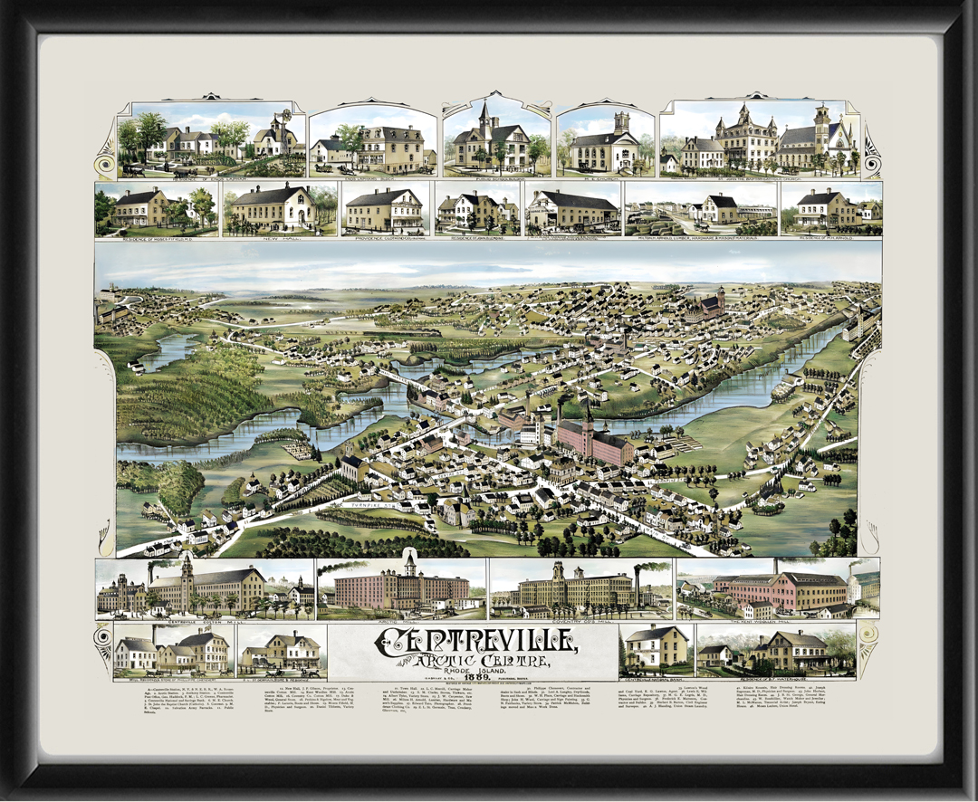 Restored bird’s eye view map of Centreville and Arctic Centre, Rhode Island, 1889 by Oakley Hoopes Bailey.