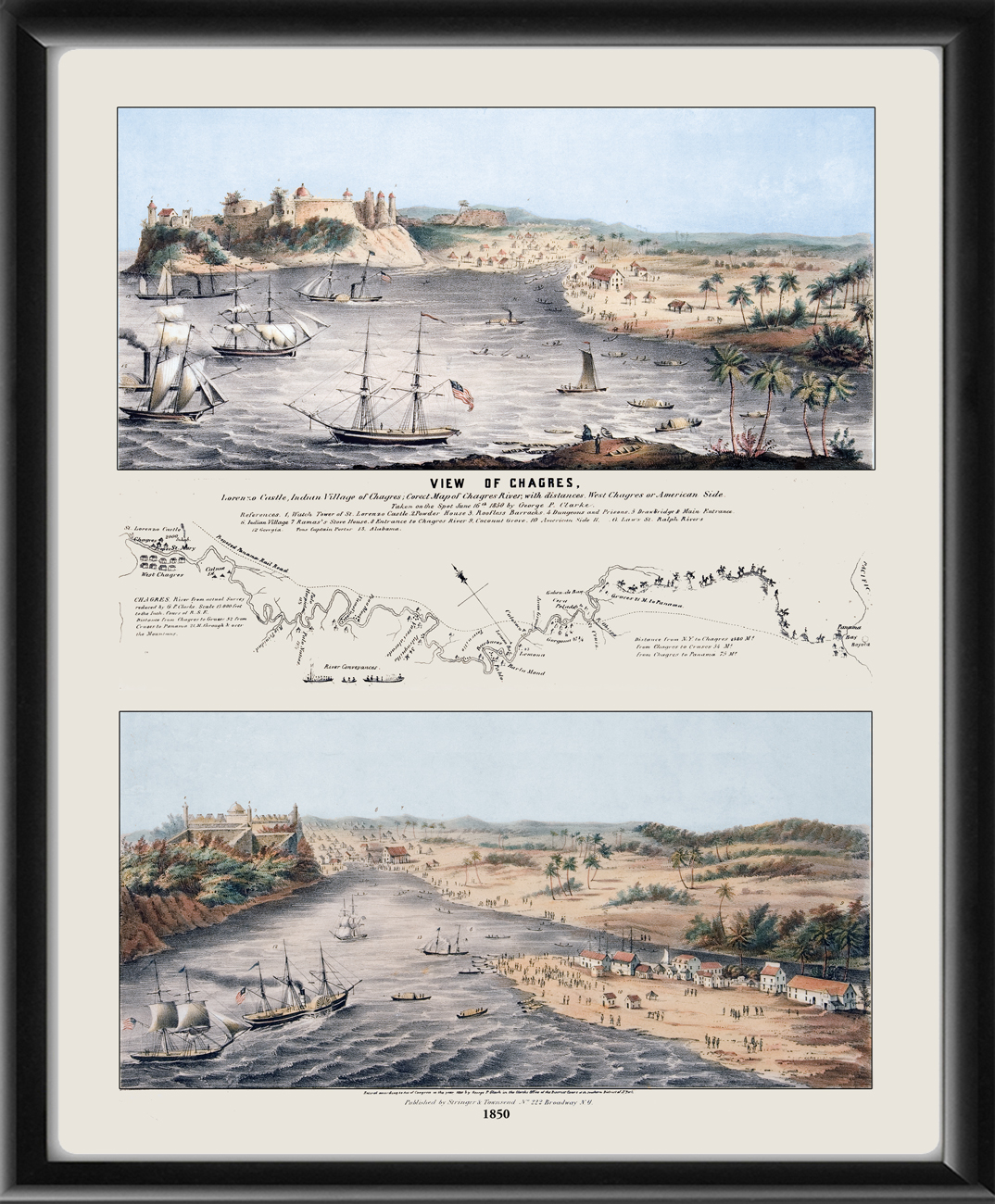 Two restored views of Fort San Lorenzo on the Chagres River, and a map of the river, 1850 by George G. Clarke.