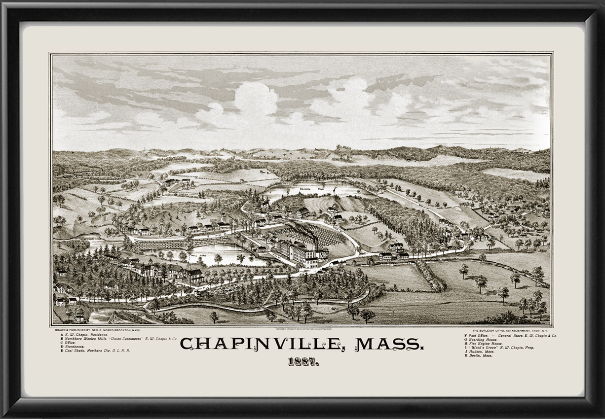 Restored bird’s eye view map of Chapinville, Massachusetts, 1887 by George Norris.