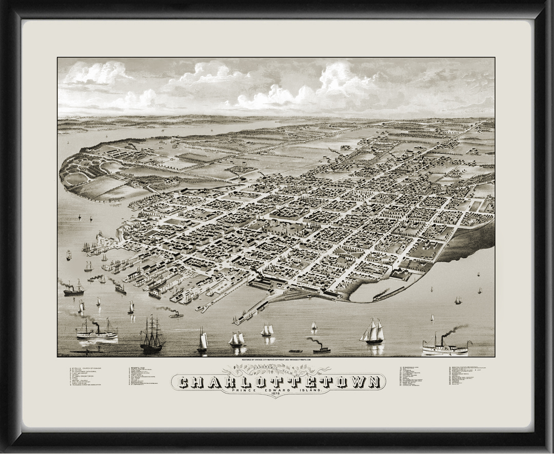 Restored bird’s eye view map of Charlottetown, Prince Edward Island, Canada, 1878 by Albert Ruger.