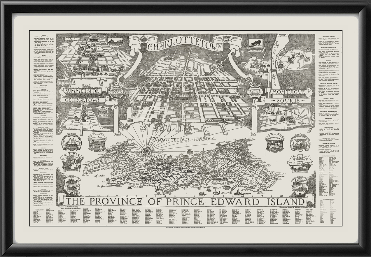 Restored illustrated plan and souvenir map of Charlottetown, Prince Edward Island, Canada, with additional inset maps of Summerside, Georgetown, Montague, and Souris, drawn in 1934 by Arthur Wallace