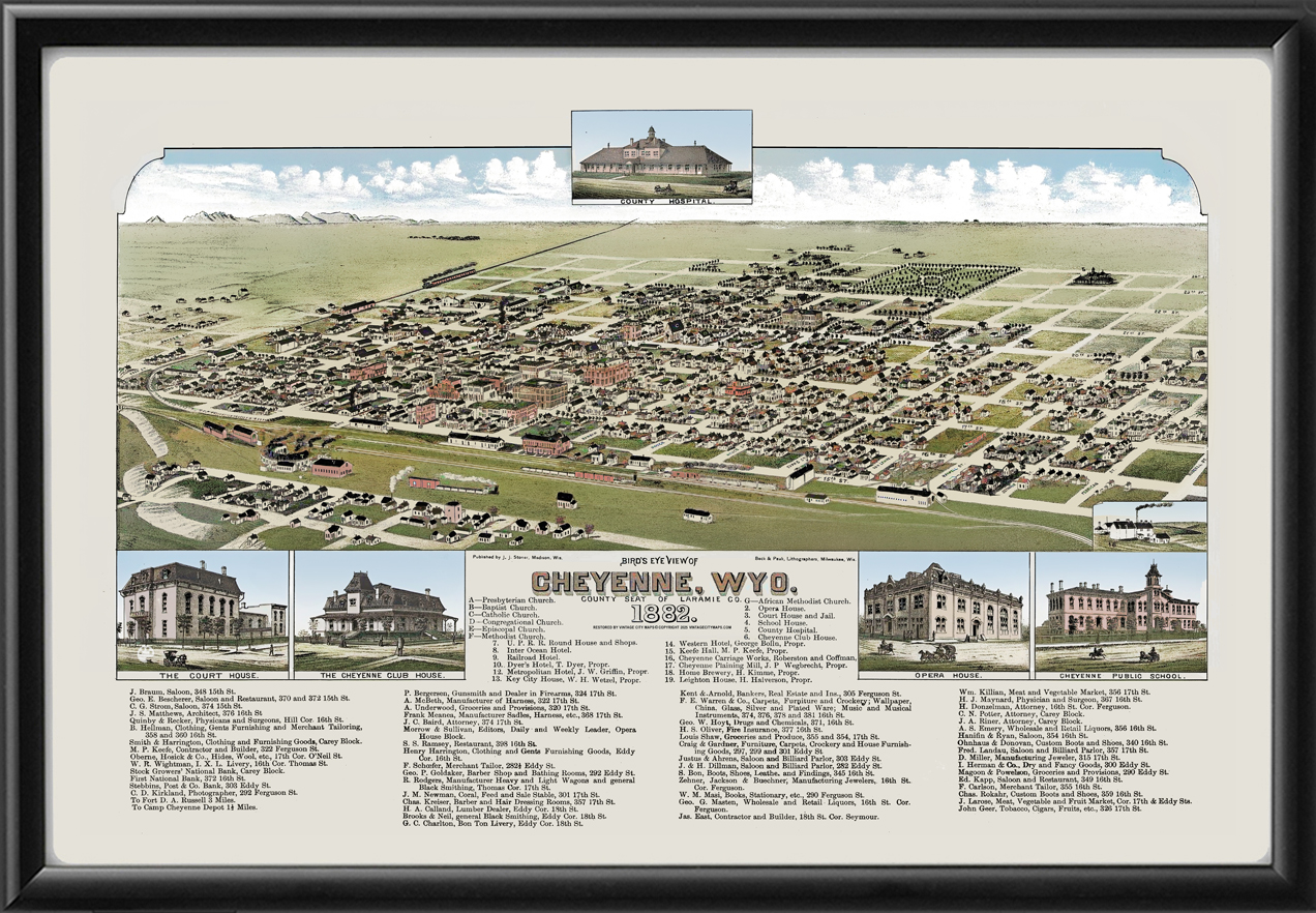Restored bird’s eye view map of Cheyenne, Wyoming, 1882 by J.J. Stoner.