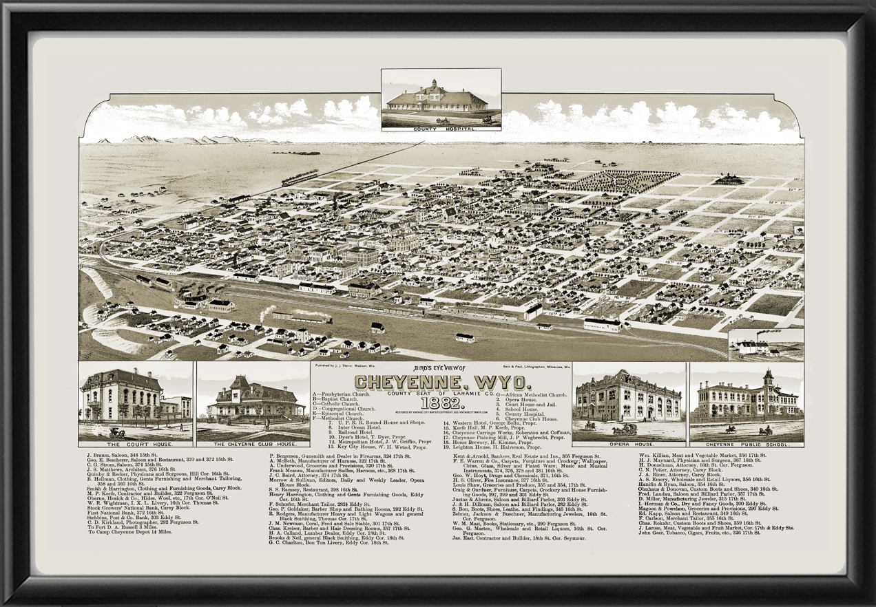 Restored bird’s eye view map of Cheyenne, Wyoming, 1882 by J.J. Stoner.