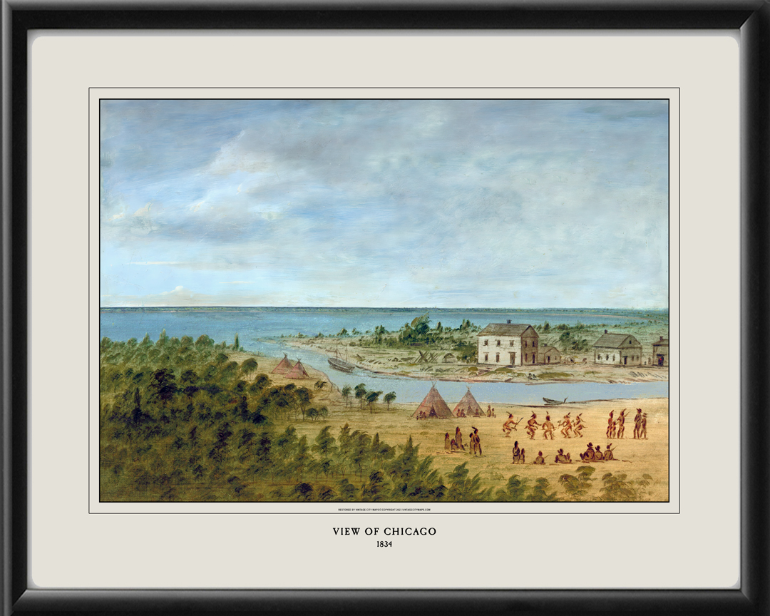 Restored bird’s eye view of Chicago, Illinois, 1834 by George Catlin, showing a party of Winnebago Native Americans dancing on the ground on which the city now stands