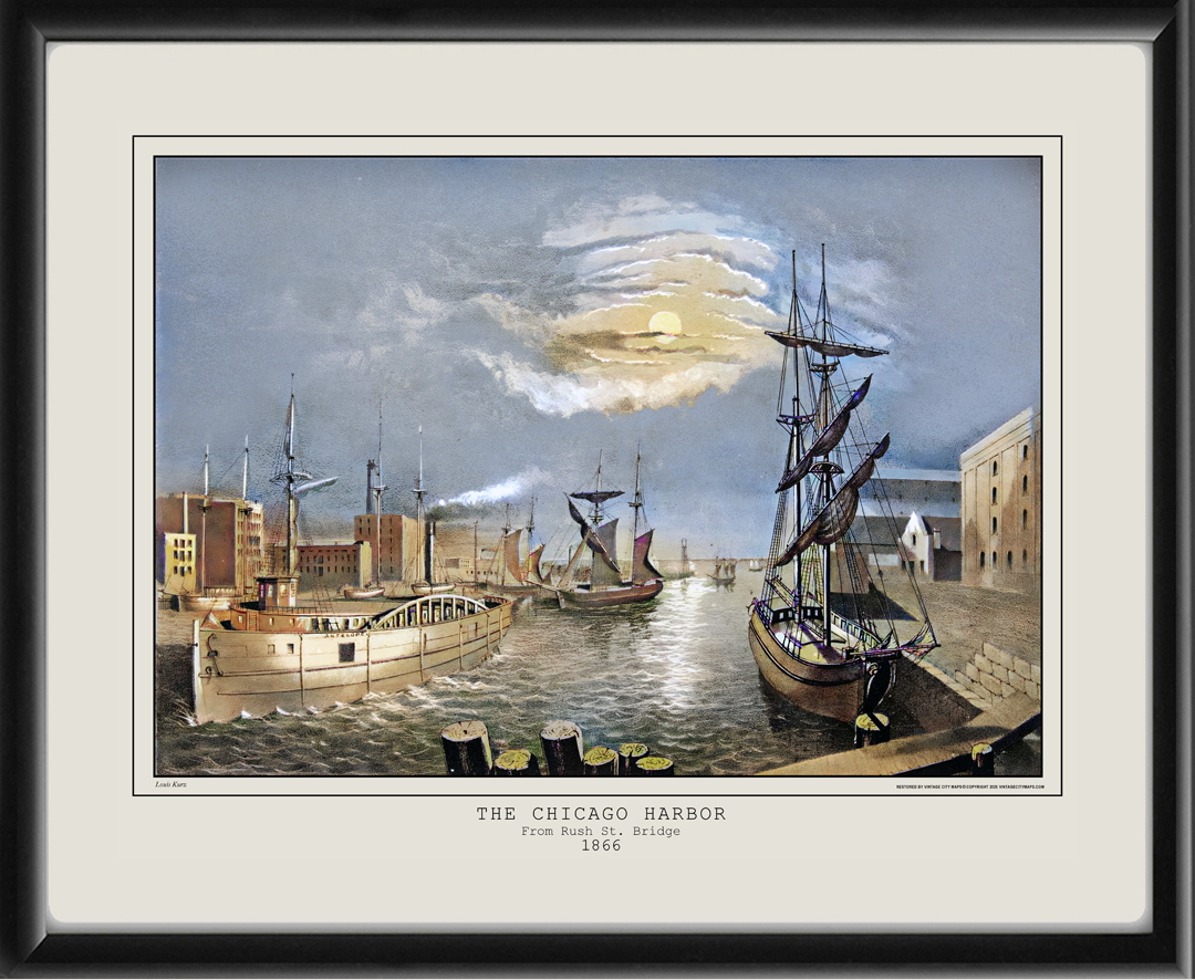 Restored bird’s eye view of Chicago, Illinois, 1866 – Chicago Harbor from Rush St. Bridge by Louis Kurz