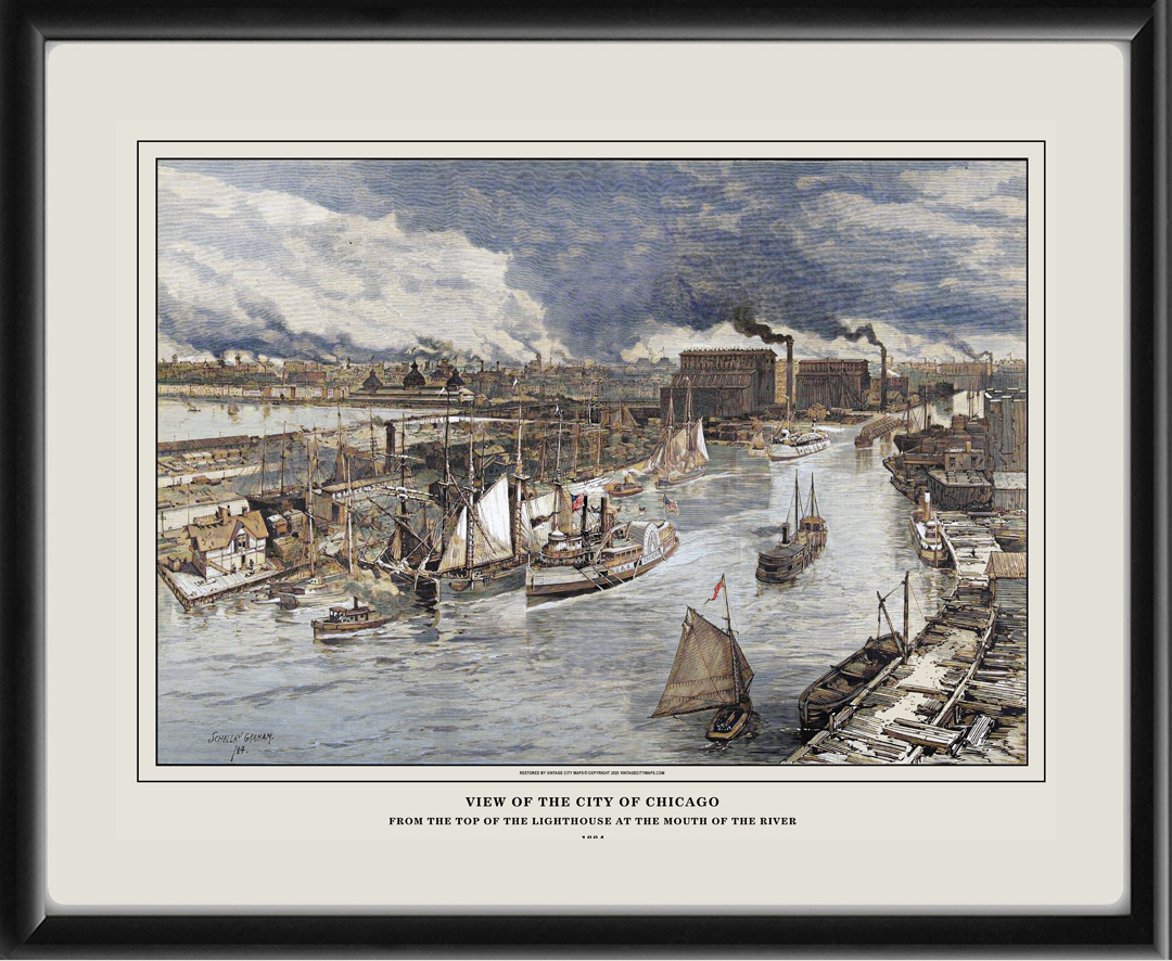Restored bird’s eye view of Chicago, Illinois, from the top of the lighthouse at the mouth of the river, 1884 by Schell and Graham