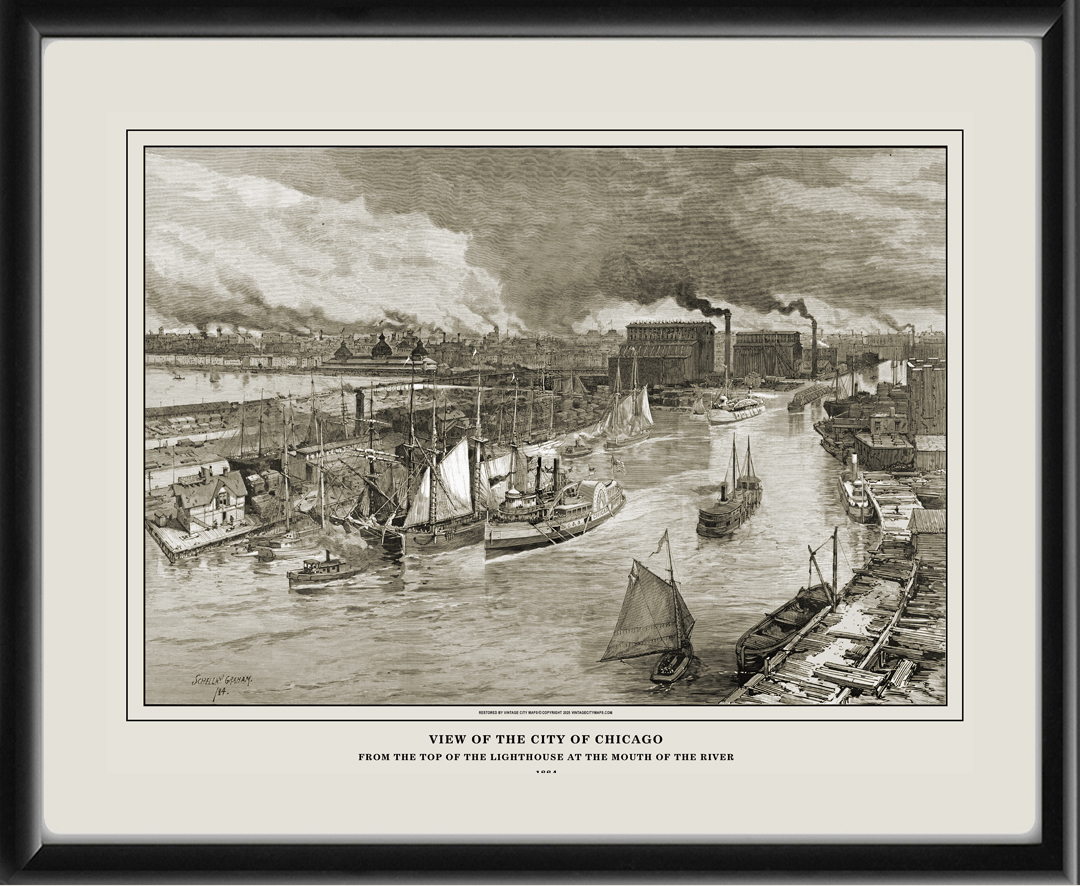 Restored bird’s eye view of Chicago, Illinois, from the top of the lighthouse at the mouth of the river, 1884 by Schell and Graham