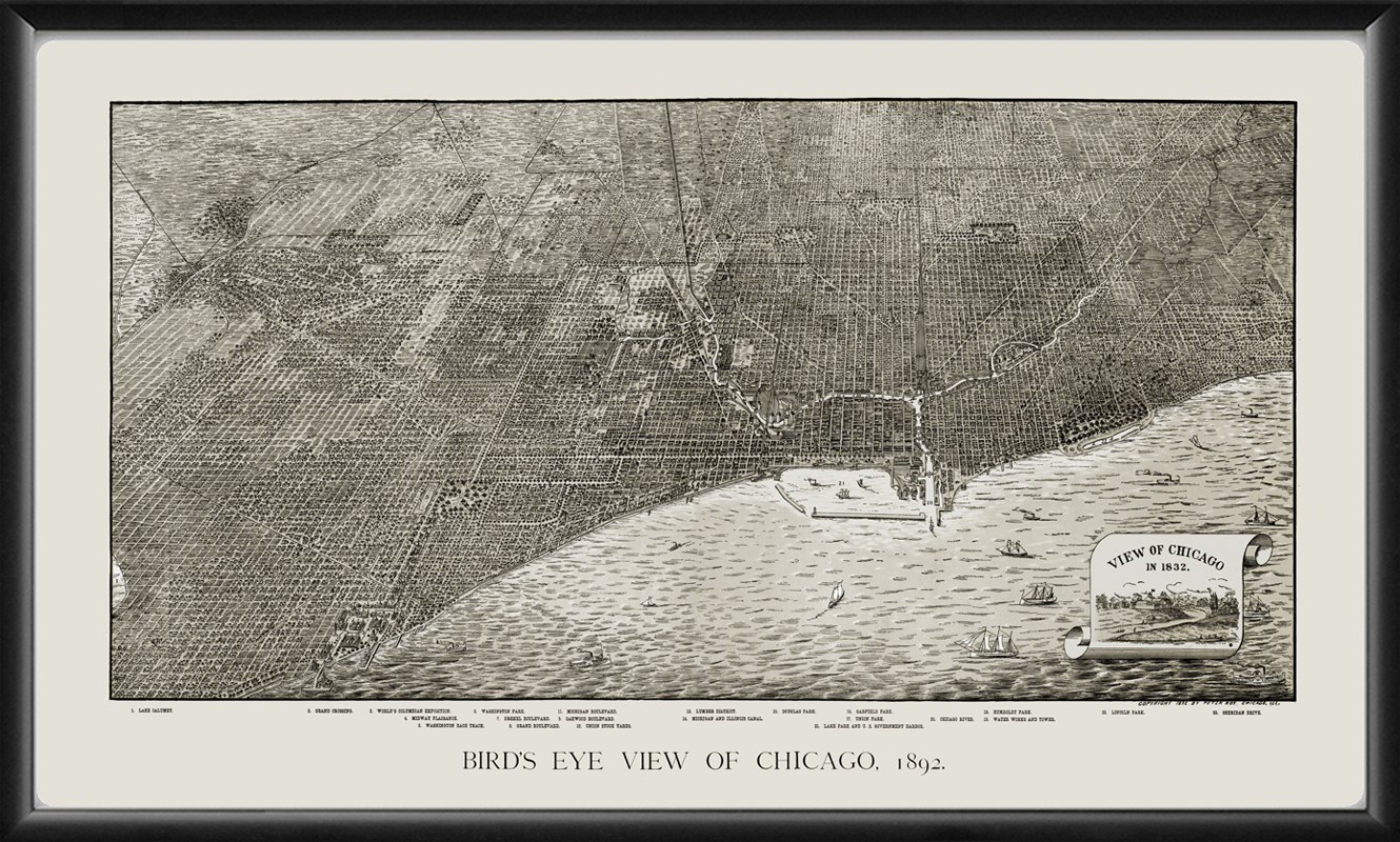 Restored bird’s eye view map of Chicago, Illinois, 1892 by Peter Roy, with an inset view of the city in 1832.