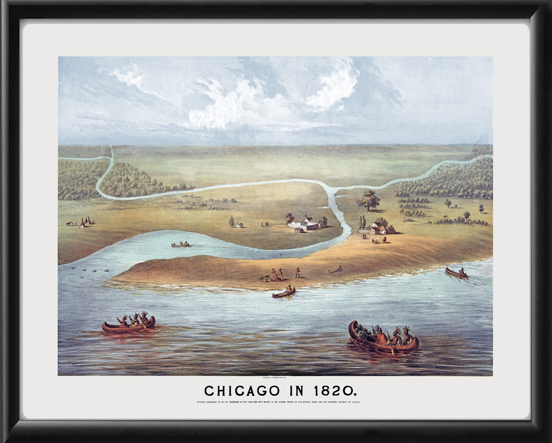 Restored bird’s eye view of Chicago, Illinois in 1820. Drawn in 1857 by an unknown artist, showing Native Americans engaged in fur trading on the banks of a river or lake at the settlement of Chicago.