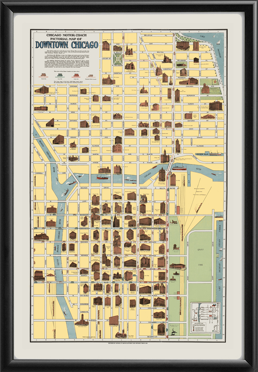 Restored Chicago Motor Coach pictorial view map of downtown Chicago, 1940 by The Clason Map Co., with illustrations of historic buildings and point of interest.