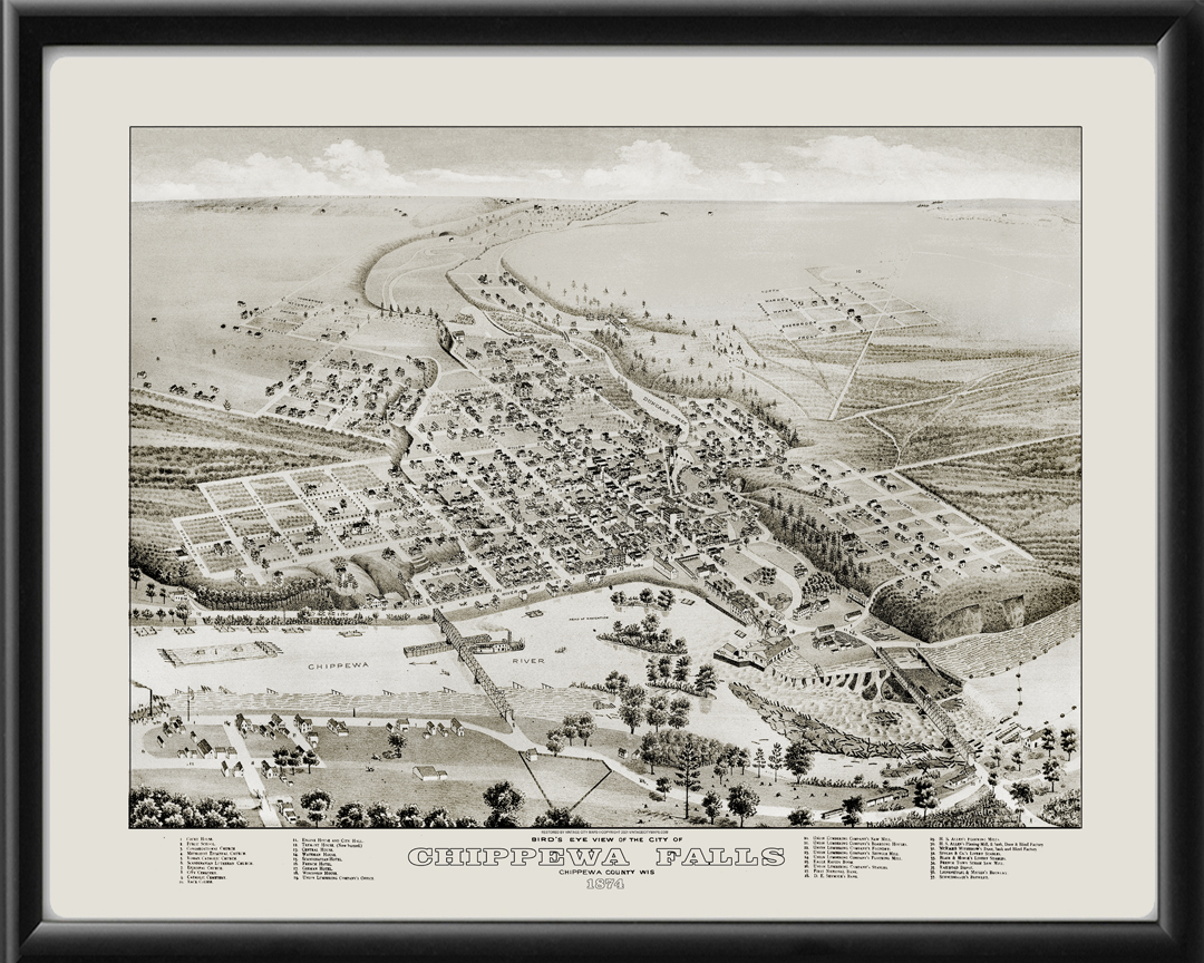 Restored bird’s eye view map of Chippewa Falls, Wisconsin, 1874.