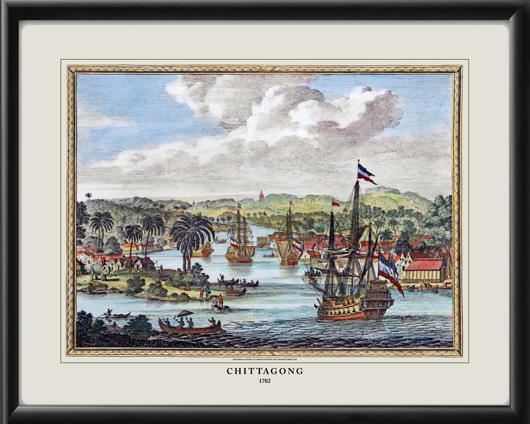 Restored panoramic view of Chittagong (Chattogram), Bangladesh showing Dutch ships in the harbor, 1702 from the original engraving by Dutch artist Peter Schenk