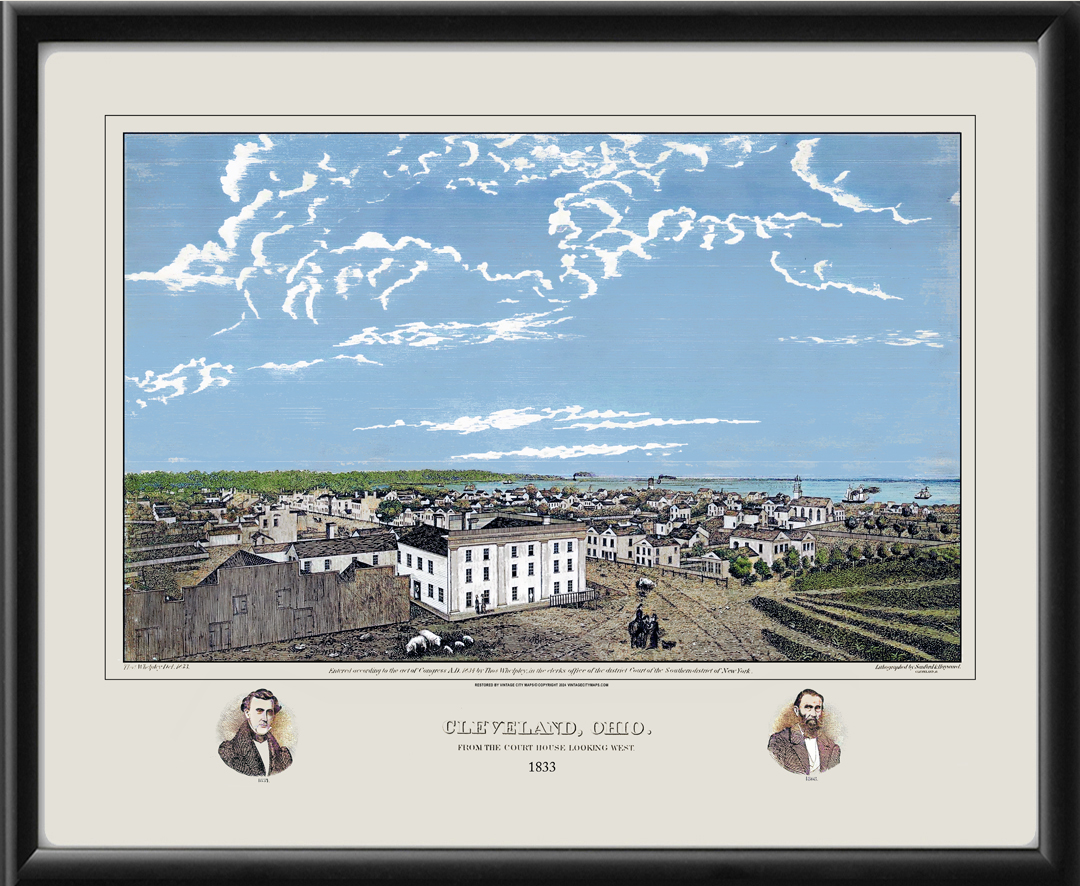 Restored panoramic view of Cleveland, Ohio, from the courthouse looking west, 1833 by Thomas Whelpley.