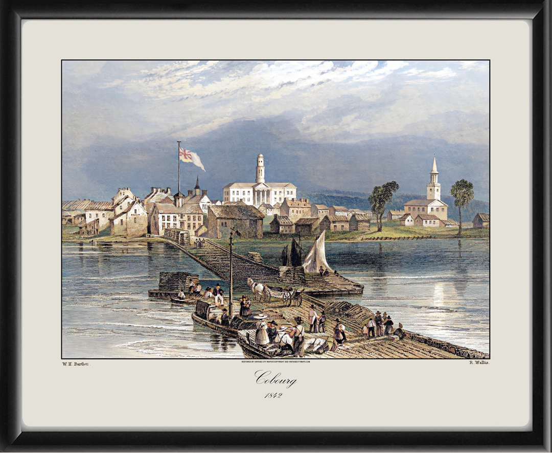 Restored view of Cobourg, Ontario, Canada as viewed from the harbor on Lake Ontario, 1842 by William H. Bartlett and engraved by R. Wallis