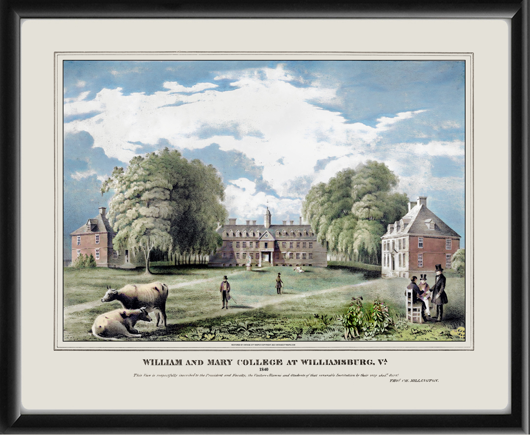 Restored bird’s eye view of College of William & Mary in Williamsburg, Virginia, 1840 by Thomas Millington.