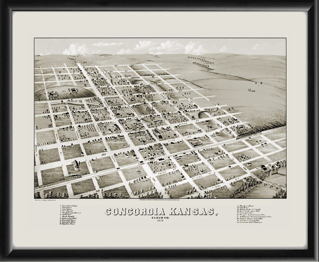 Restored bird’s eye view map of Concordia, Kansas, 1879 by J.J. Stoner.