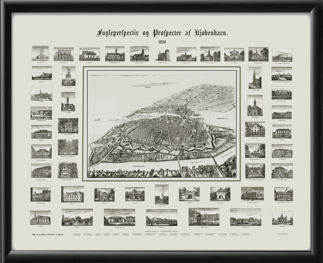 Restored bird’s eye view of Copenhagen, Denmark and suburbs, 1856 showing pictures of churches, castles, and scenes, from the original engraving by Kittendorff & Aagaard