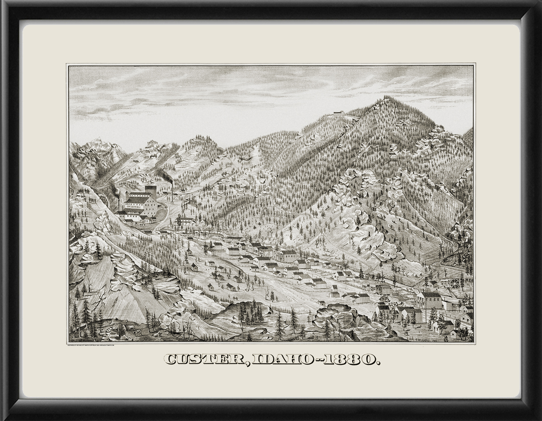 Restored bird’s eye view of Custer, Idaho, 1880 by G.W. Hall.