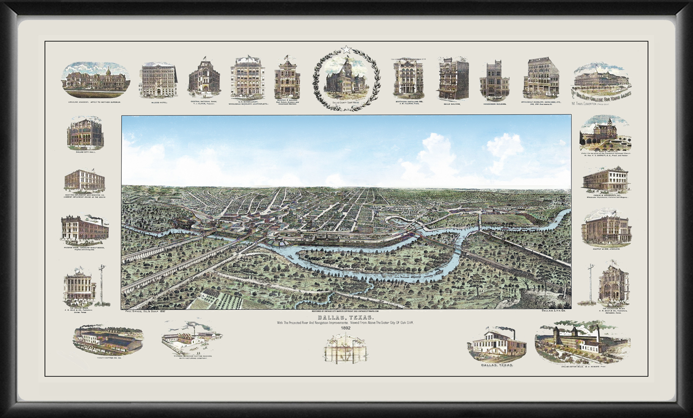 Restored bird’s eye view map of Dallas, Texas 1892 by Paul Giraud, with inset illustrations of factories, businesses, schools, and municipal buildings.
