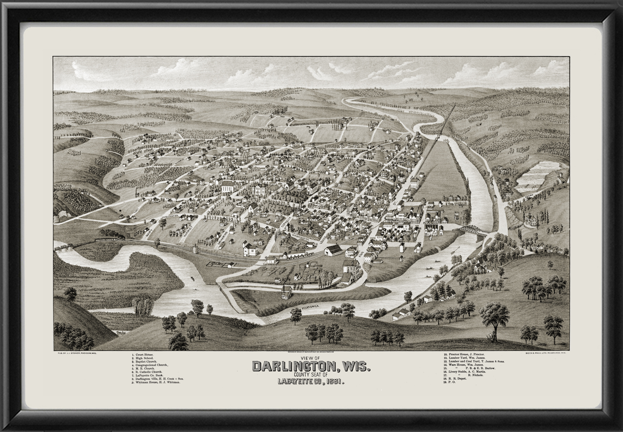 Restored bird’s eye view map of Darlington, Wisconsin, 1881 by Henry Wellge