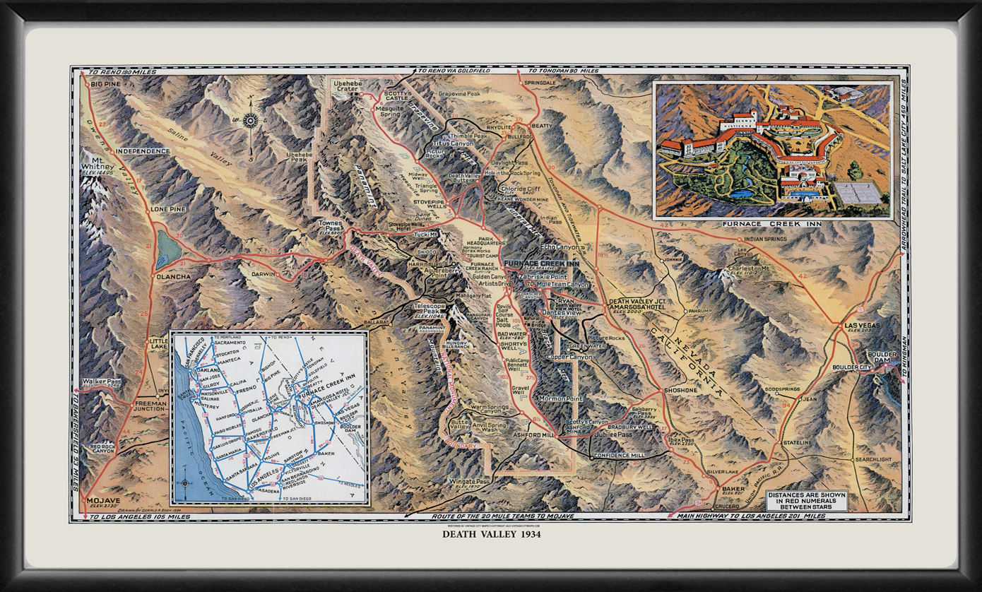 Restored bird’s eye view of Death Valley, California, 1934 by Gerald A. Eddy, extending from Mount Whitney and Walker’s Pass to the West to Las Vegas and Boulder Dam to the East, and an inset view of Furnace Creek Lodge.