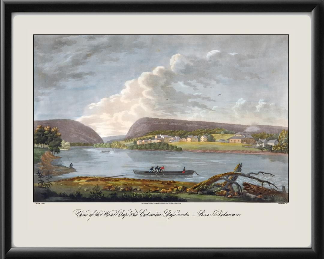 Restored view of “Water Gap and Columbia Glass Works – River Delaware,†Columbia, New Jersey, from an original engraving by Thomas Birch and William Strickland circa 1820