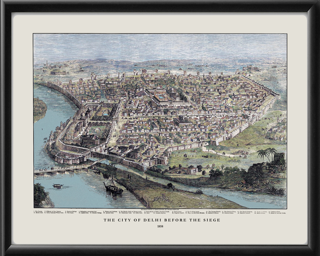 Restored bird’s eye view of the City of Delhi before the siege, from the original engraving published in the Illustrated London News, 1858.