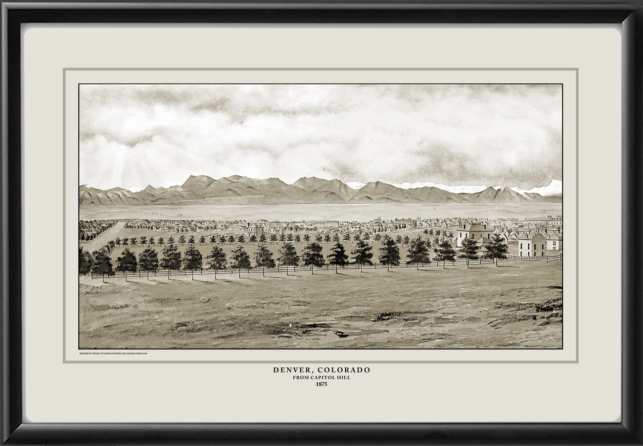Restored panoramic view of Denver, Colorado, 1875 – From Capitol Hill vicinity showing Colfax Avenue, from an original watercolor painting