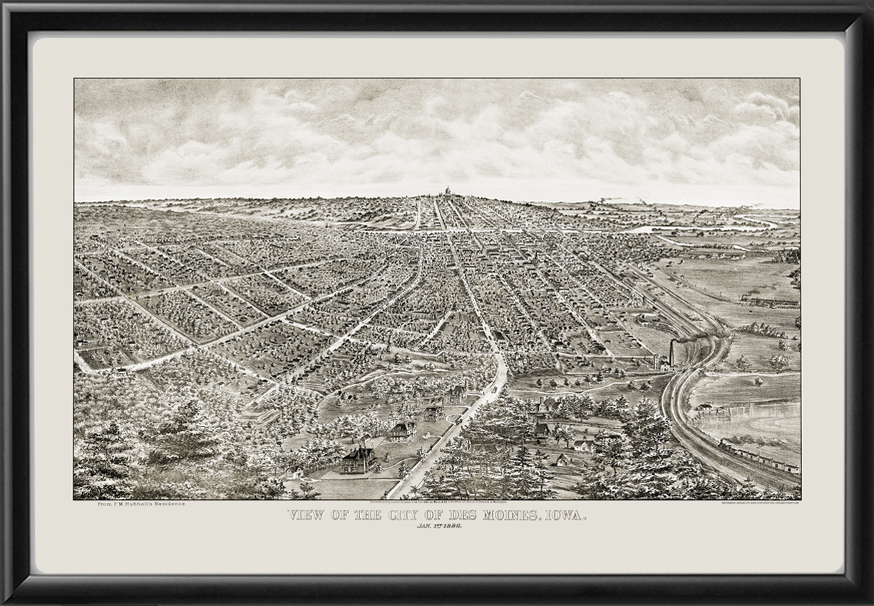 Restored bird’s eye view map of Des Moines, Iowa, 1886 by Mills & Co.
