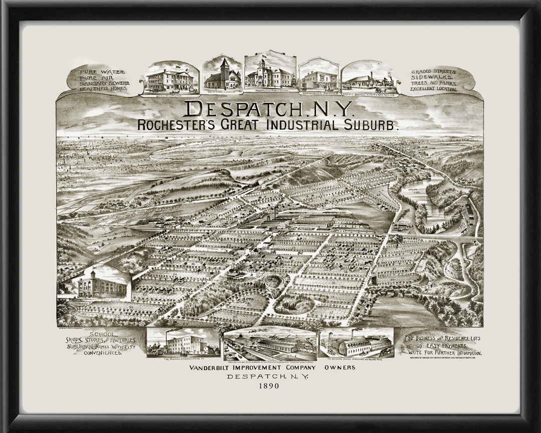 Restored bird’s eye view of Despatch, New York – “Rochester’s Great Industrial Suburb” – 1890, by Oakley Hoopes Bailey.
