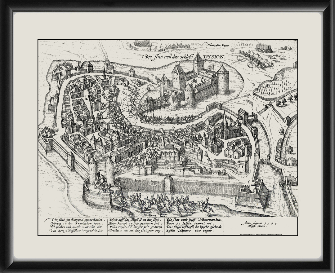 Restored bird’s eye view map of the city of Dijon, France, 1595 depicting Henri IV entering Dijon after his victory at Fontaine-Francaise over Spain, June 5th, 1595