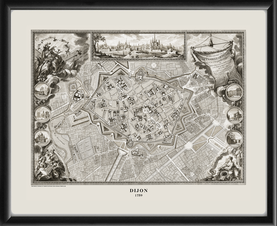 Restored bird’s eye view map of the city of Dijon, France, 1759 by Charles Élie Le Jolivet, and engraved by L. Lempereur