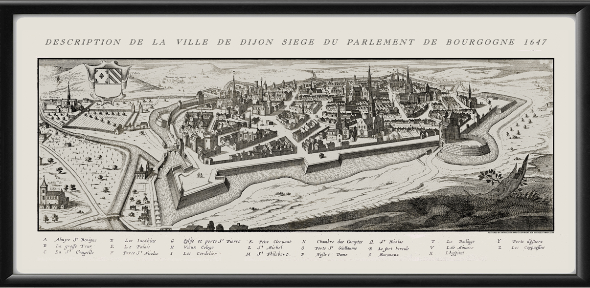 Restored panoramic view of the city of Dijon, France seat of the Parliament of Burgundy, 1647 by Jean Boisseau
