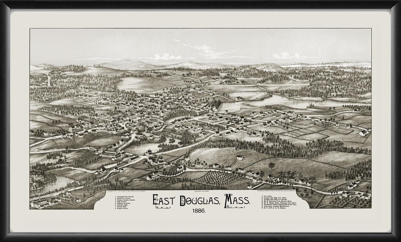 Restored bird’s eye view map of East Douglas, Massachusetts, 1886 by Lucien R. Burleigh.