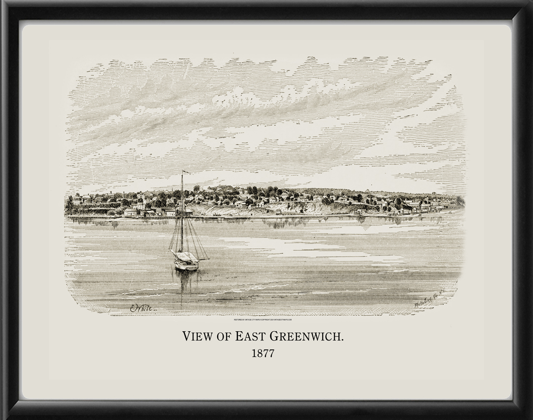 Restored panoramic view of East Greenwich, Rhode Island, 1877 from the original engraving by E. White.