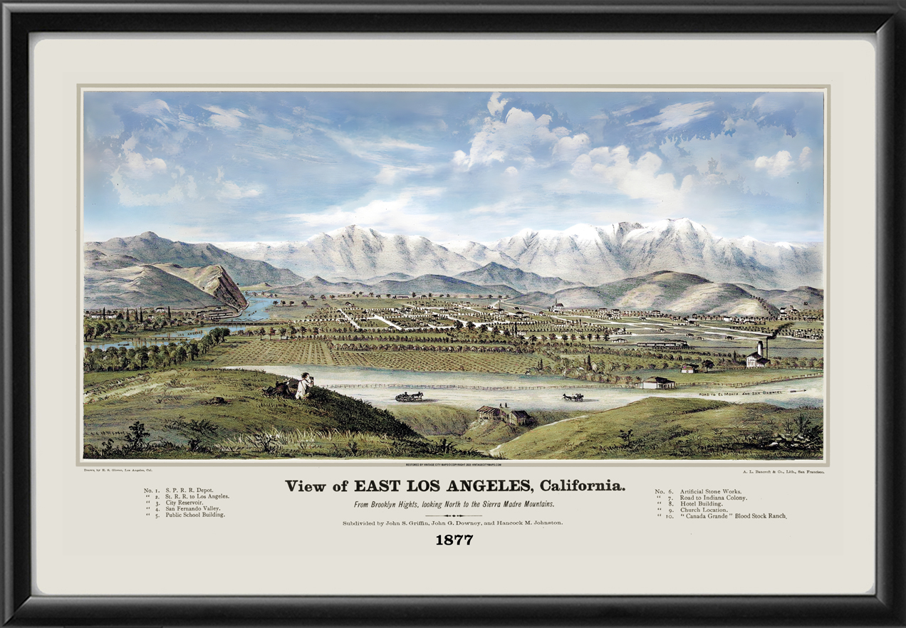 Restored bird’s eye view of East Los Angeles, California, 1877 by Eli Sheldon Glover.