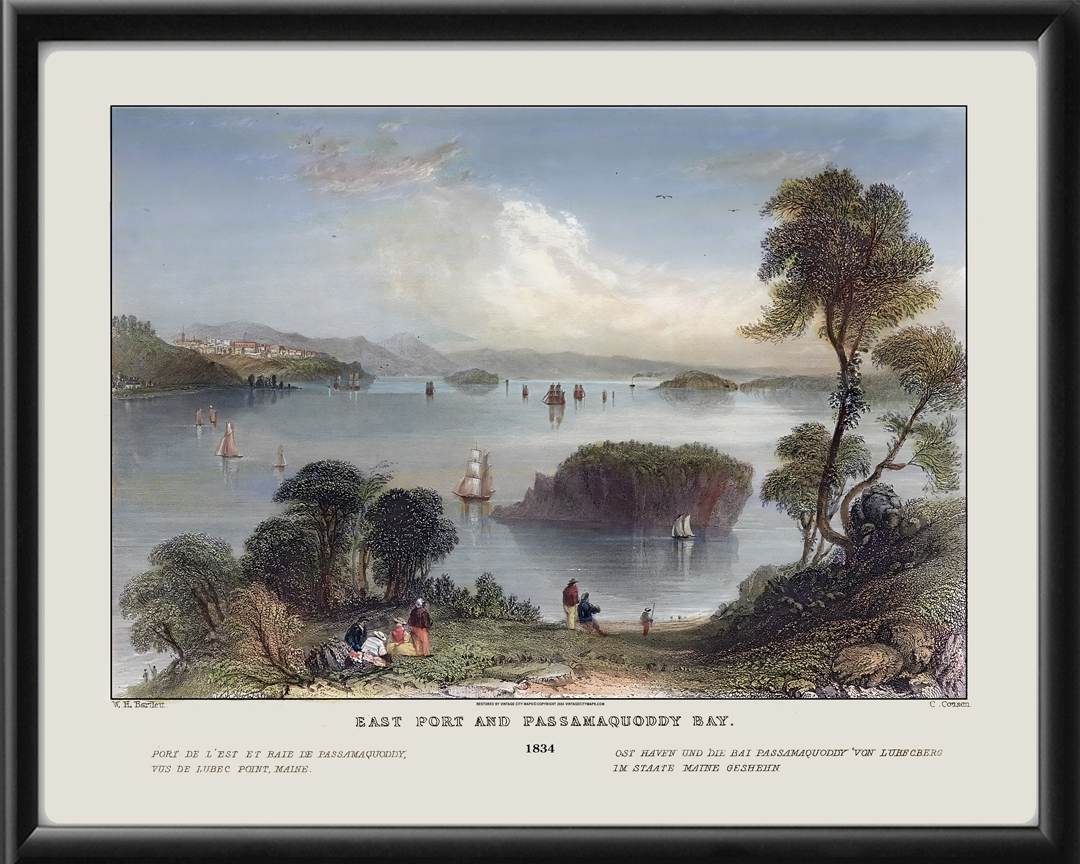 Restored bird’s eye view of East Port & Passamaquaddy Bay, Maine, viewed from Lubec Point, 1834 by William Henry Bartlett