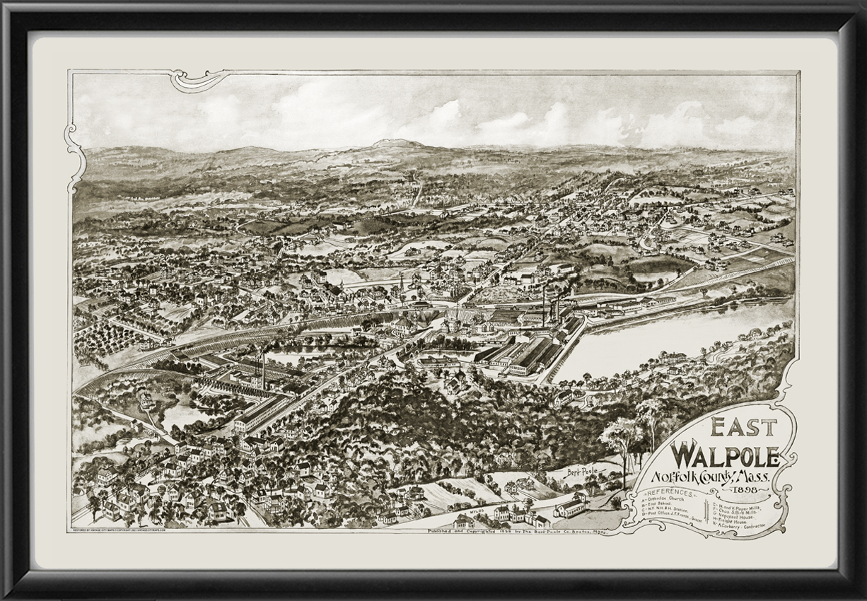 Restored bird’s eye view map of East Walpole, Massachusetts, 1898 by A.F Poole.