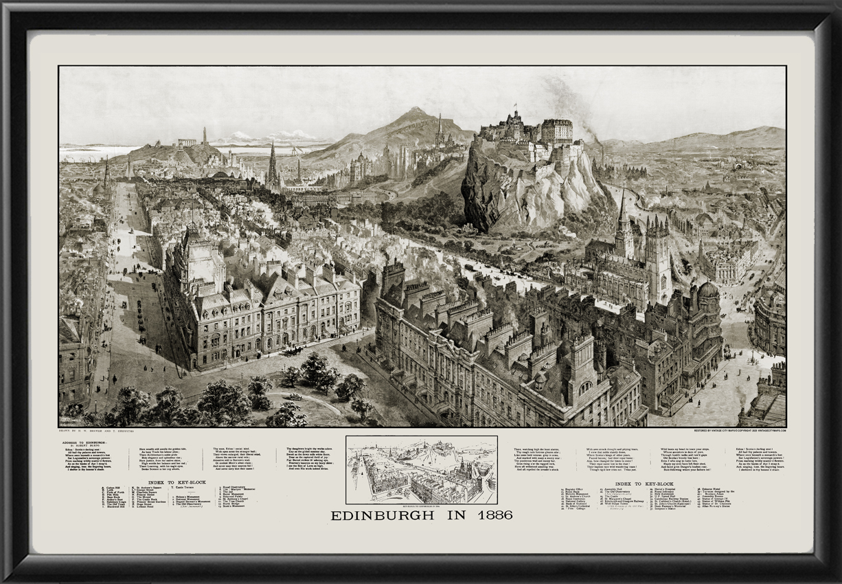 Restored bird’s eye view of Edinburgh, Scotland 1886 by H.W. Brewer and T. Griffiths.