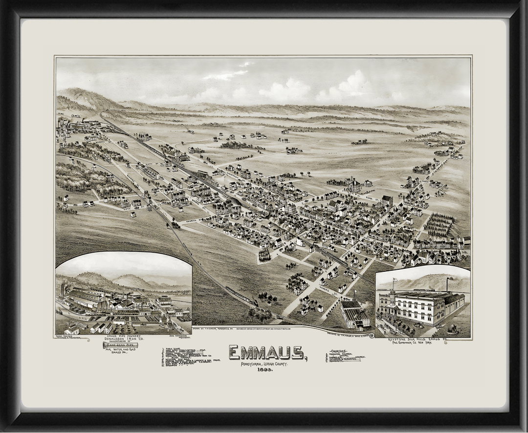 Restored bird’s eye view map of Emmaus (Emaus) Pennsylvania, 1893 by Thaddeus Mortimer Fowler.