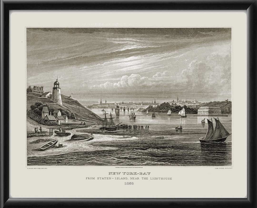 Restored bird’s eye view of New York Bay from Staten Island near the lighthouse, 1850, drawn by W. Heine and engraved by John Poppel