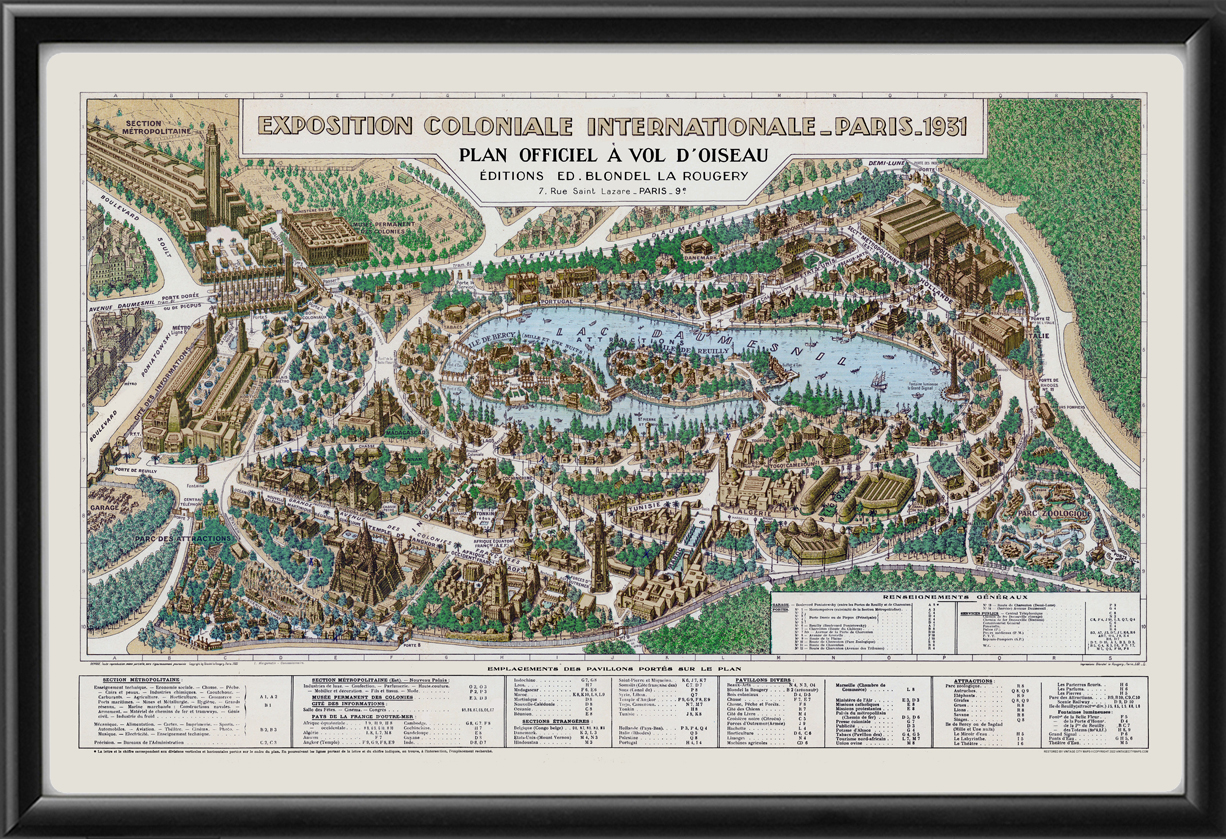 Restored official bird’s eye view of the Exposition Coloniale Internationale in Paris, France, 1931 by Blondel la Rougery.