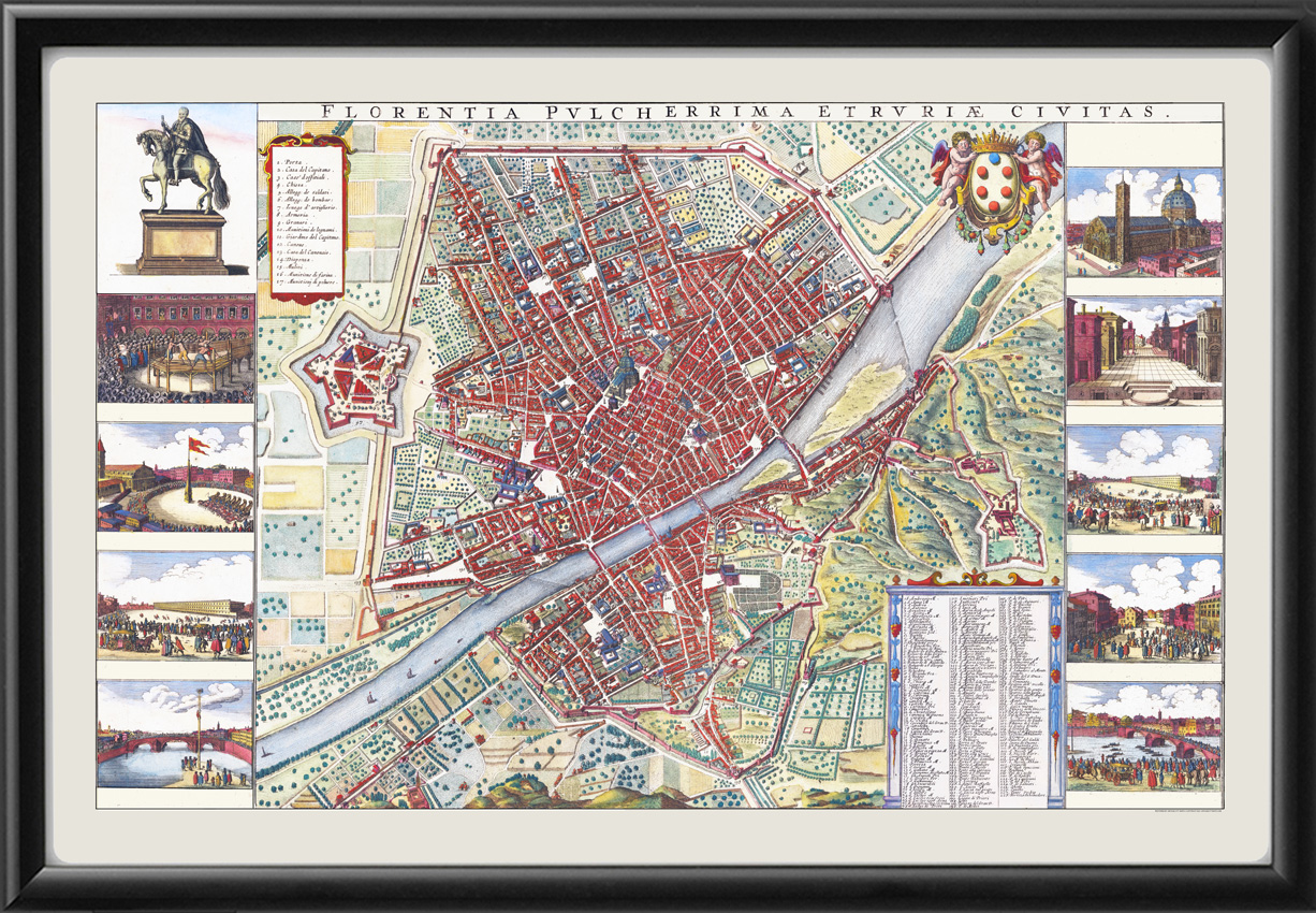 Restored bird’s eye view map of Florence, Italy, circa 1660 by Wenceslaus Hollar, showing insets along with the Medici coat of arms with balls, and a legend with 228 entries referencing buildings and places on the map.