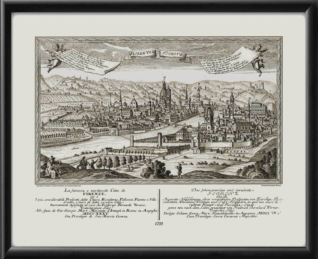 Restored bird’s eye view of Florence, Italy 1735, from the original engraving by Friedrich Bernhard Werner