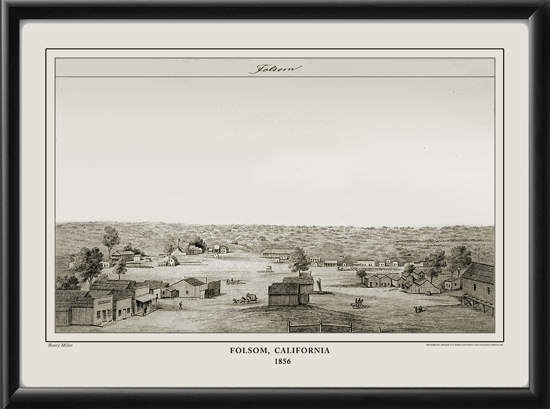 Restored bird’s eye view of Folsom, California, from the original sketch by Henry Miller, 1856.
