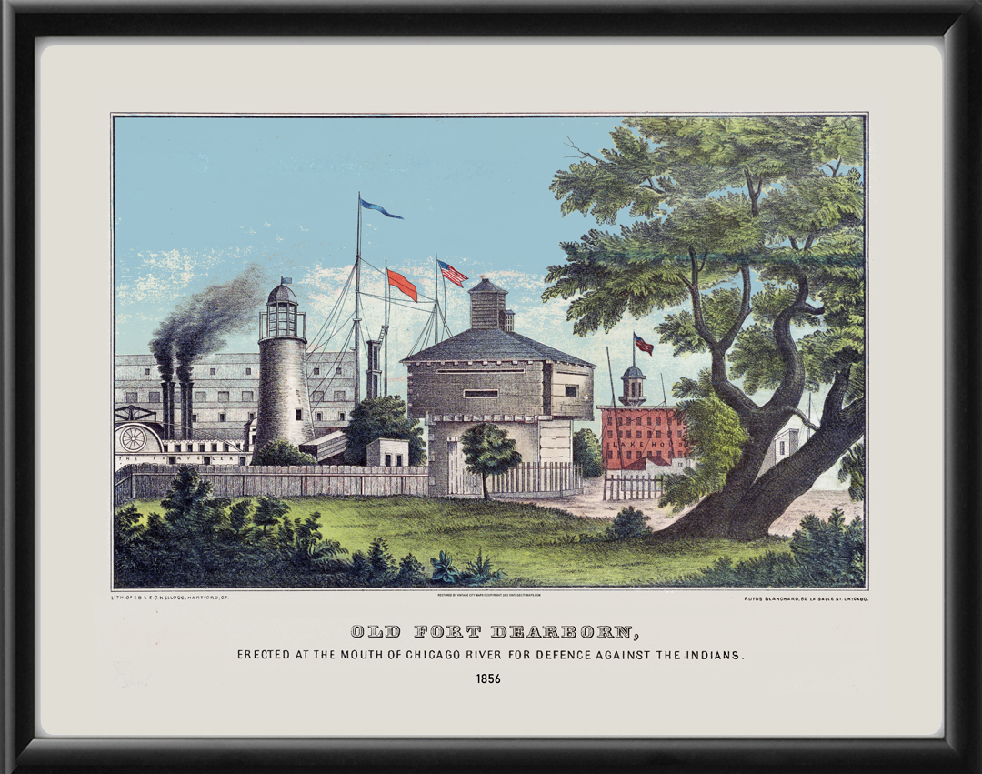 Restored view of Old Fort Dearborn, at the mouth of the Chicago River, 1856 by Rufus Blanchard.