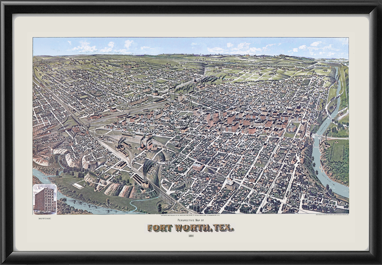 Full color restored bird’s eye view map of Fort Worth, Texas, 1891 by Henry Wellge.