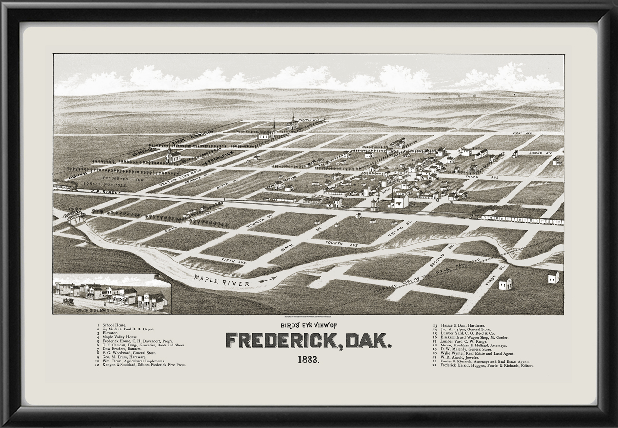 Restored bird’s eye view map of Frederick, South Dakota, 1883 by Henry Wellge.